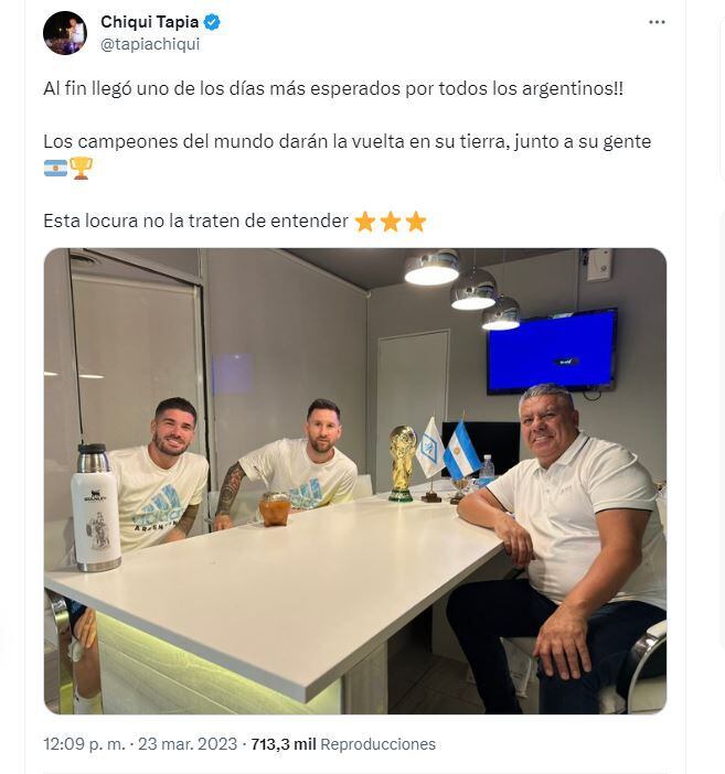 La primera imagen que Tapia compartió en su cuenta de Twitter junto a De Paul y Messi fue en marzo de 2022, a poco tiempo de haber ganado la Copa América, cuando restaban apenas un par de meses para obtener la Finalissima contra Italia y bastante antes de viajar a Qatar. "Charlas y mates con los Campeones de América. La Scaloneta, nuestro Plan A", fue el posteo del presidente junto a los futbolistas y una réplica miniatura de la Copa América.