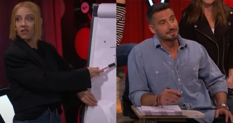 La dinámica de la clase se instaló en el estudio como una suerte de "escuelita". La vocalista asumió el rol de docente y, con una pizarra, invitó a sus "alumnos" —Nico Occhiato, Lali Espósito, Soledad Pastorutti, Ale Sergi y Luck Ra— a prestar atención y guardar silencio, como si se tratara de una auténtica lección escolar. "Silence, silence, Loneliness (Soledad)", dijo, mientras repasaba frases y títulos de canciones en inglés, buscando que todos, pero especialmente el conductor, mejoraran su pronunciación.