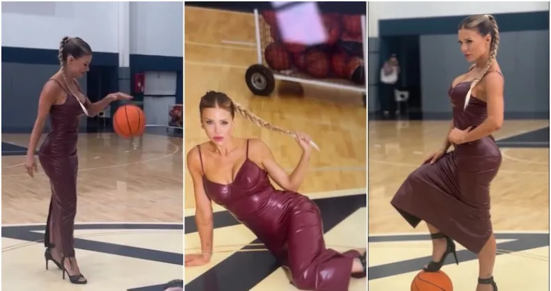A unos kilómetros de esa ribera, la escena cambia por completo: el parquet de una cancha de básquetbol refleja las luces industriales en líneas rectas y sombras severas. Allí la influencer, sentada entre las marcas blancas del campo, aparece como un fragmento de otro universo. Vestida con un ajustado vestido rojo oscuro, acabado brillante y sandalias de taco alto, sostiene en la mano su pelo; a sus espaldas, un carrito repleto de balones amenaza con romper cualquier lógica de etiqueta.