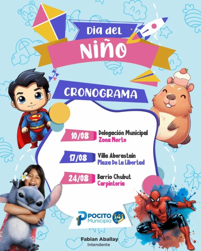 Además, aprovechando que durante agosto se celebra el Día del Niño, se realizarán tres chocolates para todos los pequeños de Pocito, momento en el que podrán disfrutar de juegos y una gran cantidad de sorteos.