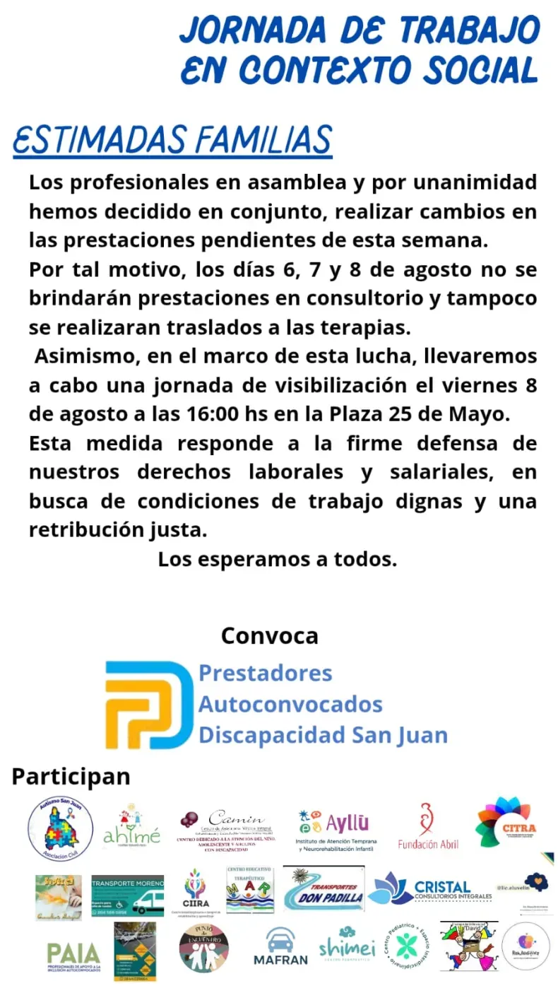 Según el escrito, acordaron no ofrecer servicios en consultorio ni realizar traslados hacia las terapias programadas durante la semana. En este contexto, decidieron llevar a cabo una jornada de visibilización y trasladar estas prestaciones al viernes 8 de agosto, de 16:00 a 19:00 horas, en la plaza 25 de Mayo.