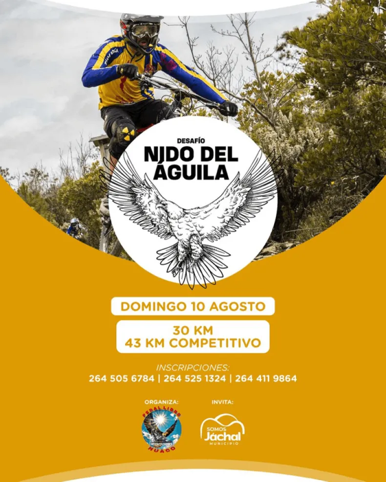 La adrenalina y el espíritu deportivo volverán a hacerse sentir en Huaco con una nueva edición del Desafío Nido del Águila, una de las competencias más esperadas por los fanáticos del mountain bike (MTB). La cita será este domingo 10 de agosto, en un entorno imponente que pondrá a prueba la resistencia y la pasión por el pedal. El evento ofrece dos circuitos especialmente diseñados para distintos niveles de exigencia: una categoría recreativa de 30 kilómetros y otra competitiva de 43 kilómetros, ideal para quienes buscan superar sus límites en un escenario natural incomparable. La competencia no solo promete emoción y desafío, sino también la posibilidad de recorrer paisajes únicos del norte sanjuanino, donde la montaña, el aire puro y el esfuerzo físico se combinan en una experiencia inolvidable. Los interesados pueden inscribirse o solicitar más información a través de los siguientes números: 264 505 6784 | 264 525 1324 | 264 411 9864