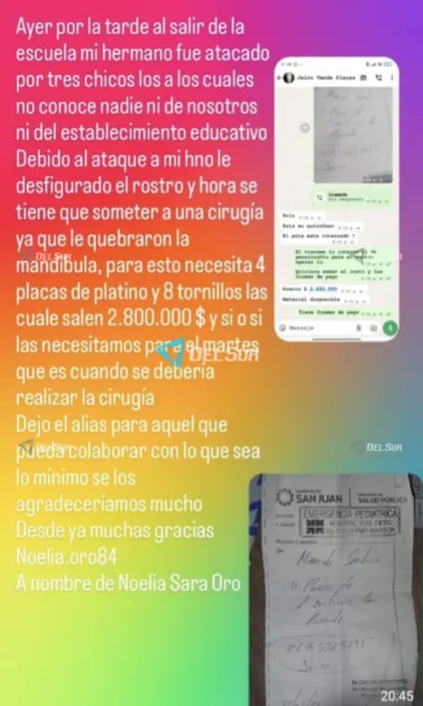 En la jornada del martes, un violento episodio sacudió la tranquilidad del departamento Rawson. Santino Miranda, un estudiante de la Escuela Secundaria José Manuel Estrada, fue atacado por tres chicos desconocidos cuando salía del establecimiento junto a sus compañeros. Producto de ese hecho, hoy atraviesa una complicada situación de salud y necesita de la solidaridad de la comunidad sanjuanina para poder recibir la atención médica que requiere.