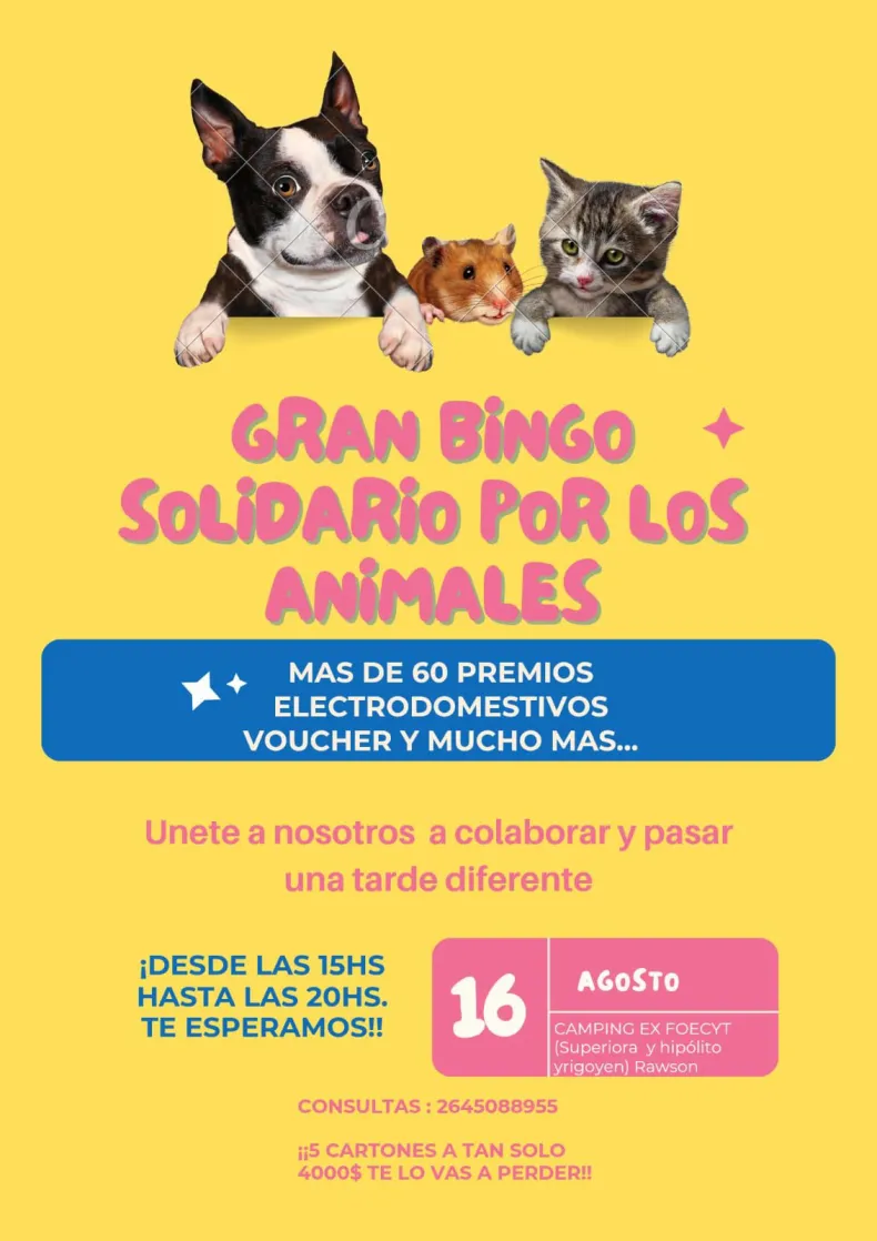 La Fundación Ayudando Patitas está armando una movida que no te podés perder. Este sábato 16 de agosto, de 15 a 20 horas, el Camping For the Seed en San Juan se va a llenar de buena onda y solidaridad con un bingo solidario que promete ser una fiesta. La idea es juntar guita para cubrir los gastos veterinarios y la alimentación de esos perritos y gatitos que han pasado por situaciones de maltrato o abandono.