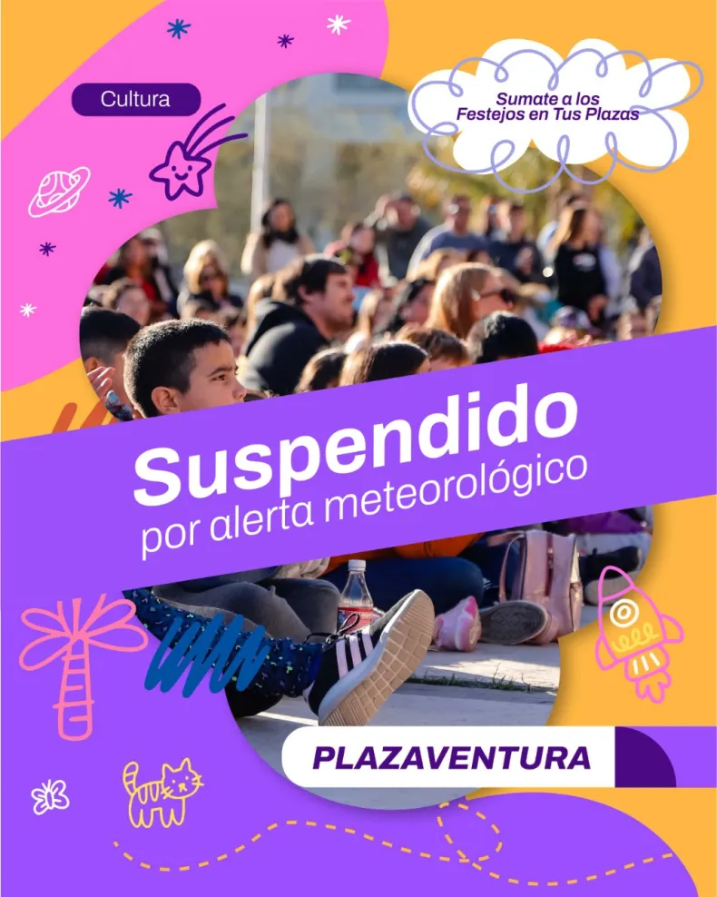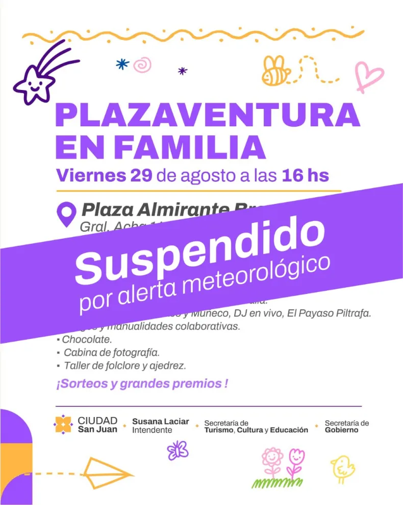 La Municipalidad de la Ciudad de San Juan informa a la comunidad que, debido a la alerta meteorológica vigente, la actividad "Plazaventura en Familia" prevista para este viernes 29 de septiembre en Plaza Almirante Brown queda suspendida por razones de seguridad.