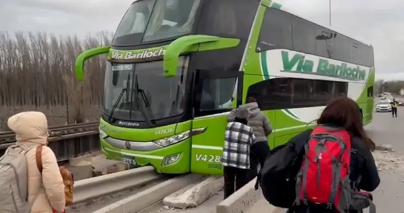 El quilombo se armó sobre el Puente Carretero, yendo para el lado de Neuquén. Por causas que todavía se investigan, el vehículo impactó contra el guardarraíl y, como si nada, se deslizó peligrosamente hacia el vacío. Testigos que pasaban por ahí contaron que el colectivo de Vía Bariloche quedó sostenido de milagro, con media formación en el aire. "Chocó contra el cordón, se llevó el guardarraíl y quedó en el aire", relató uno a un diario local. El conductor, de Misiones, y los 23 pasajeros rumbo a Bariloche se salvaron de milagro, aunque hubo daños materiales y un manso embotellamiento.