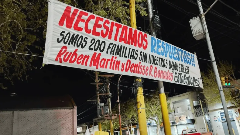 En uno de los pasacalles se puede leer: "NECESITAMOS RESPUESTAS, SOMOS 200 FAMILIAS SIN NUESTROS INMUEBLES. Rubén Martín y Denisse R. Bonade. Estafadores". ¡Directo al hueso! Otro, más picante, lanza: "Estafadores, delincuentes, ¿quién los cubre?". Los mensajes no se andan con chiquitas y aparecieron en puntos estratégicos de la ciudad, como Libertador y Urquiza y Ignacio de la Roza y Las Heras. Esto ya es un tema de estado, porque la semana pasada se había colocado otro pasacalle en Libertador y Av. Rioja.