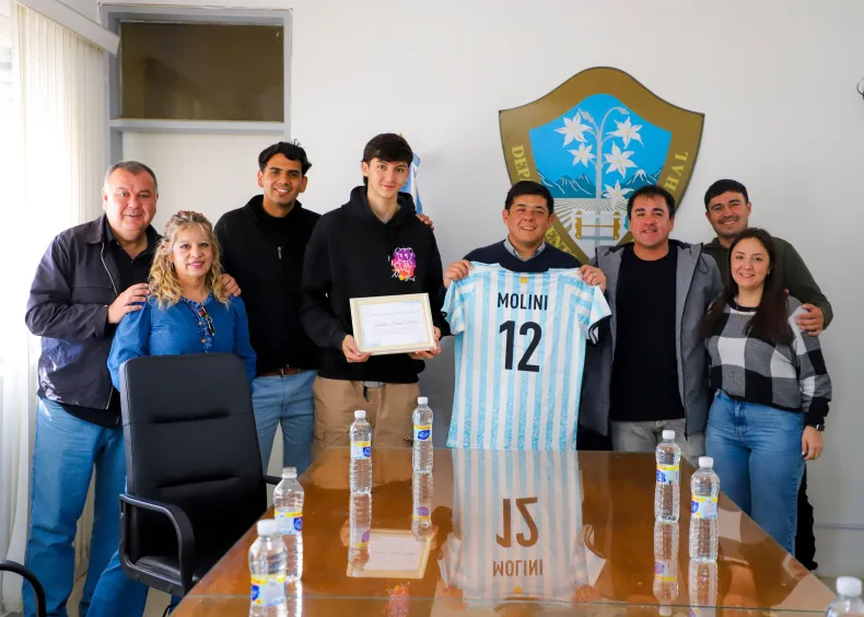 El destacado voleibolista Emiliano Nahuel Molini, nacido en Mendoza pero con raíces profundas en Jáchal, visitó el municipio junto a su familia y fue recibido en el despacho del intendente Matías Espejo, acompañado por los coordinadores de Deportes Facundo Mercado y Sebastián Páez