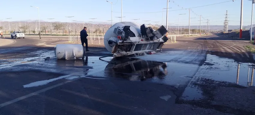 Un insólito episodio vial sorprendió este lunes a quienes circulaban por el ingreso a la rotonda de calle Costanera y Salta. Un camión de la empresa H3, dedicado al transporte de hormigón elaborado, sufrió el desprendimiento de su pesada máquina hormigonera —conocida popularmente como "mate"— mientras giraba.