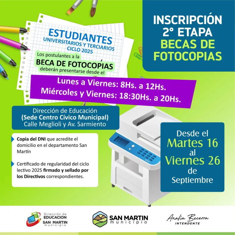 La Municipalidad de San Martín informa que del martes 16 al viernes 26 de septiembre se llevará a cabo la segunda etapa de inscripción para las Becas de Fotocopias, destinadas a estudiantes universitarios y terciarios que cursan el ciclo lectivo 2025.