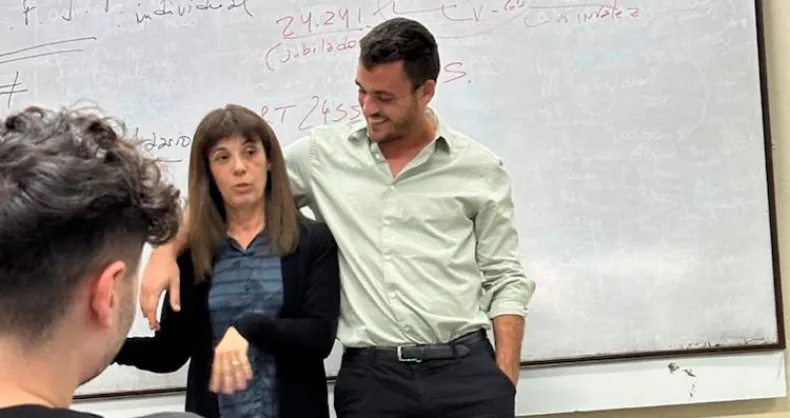 Gabriela Gamen, lejos de buscar un título más, quería seguir aprendiendo. Y no eligió cualquier cosa: se metió de cabeza en Marketing Digital, ¡con su propio hijo, Tomás Cazalá, como profesor en la UBA! Él le puso una condición: tenía que rendir todo y comprometerse al cien por cien, como cualquier alumno regular. Y ella, a sus 62 años, se la bancó.Nadie en la facultad sabía que esa alumna tan aplicada era la madre del profe. Cada domingo, cuando Tomás iba a comer a casa, la encontraba rodeada de apuntes, metiéndole con todo. Durante un cuatrimestre, compartieron el aula en silencio, guardando el secreto, como si ese vínculo especial no necesitara explicaciones, solo vivirse.El último día de clases, al entregar las notas, Tomás felicitó a sus estudiantes. Cuando invitó a los oyentes que habían completado la cursada, la vio a ella. No lo tenía planeado, pero la emoción le ganó. Con la voz quebrada, soltó la verdad ante el centenar de pibes: "Ella es mi mamá y fue mi alumna; y yo fui su docente".El aula quedó muda por un segundo, y después, la emoción explotó. Madre e hijo se dieron un abrazo que conmovió a todos. Esta escena, que ocurrió a fines de 2024, se hizo viral cuando Tomás la compartió en sus redes. "Ojalá yo tenga, a los 62, las mismas ganas de aprender que tiene ella", confesó el profe, orgulloso.Tomás, con solo 29 años, ya es profesor adjunto de la materia que él mismo impulsó en la Facultad de Ciencias Económicas. Durante la pandemia, cuando daba clases virtuales desde casa, su mamá empezó a escuchar y se enganchó. Así fue como, de a poquito, el marketing digital se volvió tema de charla familiar.Gabriela, licenciada en Sistemas y bancaria, le comentó a su hijo que quería aprender más. Tomás, ni lerdo ni perezoso, le propuso anotarse en su cátedra, pero sin ventajas. "Te acepto como oyente, pero si te lo tomás en serio: vas a rendir parciales, venir a clase y exponer el final", le dijo. Ella aceptó el desafío y, para sentirse más acompañada, invitó a una amiga.Desde el primer día, Gabriela fue una alumna más. Nadie, ni siquiera los catorce ayudantes, supo de su parentesco. Se sentaba en primera fila, participaba, estudiaba con su grupo. Tomás mantenía la distancia en clase, pero los domingos, al verla con los apuntes, sentía un orgullo zarpado. Incluso, para no llamar la atención, ella se bajaba una cuadra antes de la facultad.Lo que empezó como una curiosidad, terminó fortaleciendo la relación de madre e hijo. "Descubrí una constancia y una perseverancia en ella que me sorprendieron. Compartir el aula y el viaje me ayudó a reconectar con ella desde otro lugar", cerró Tomás, emocionado por esta experiencia que, sin dudas, los marcó para siempre.