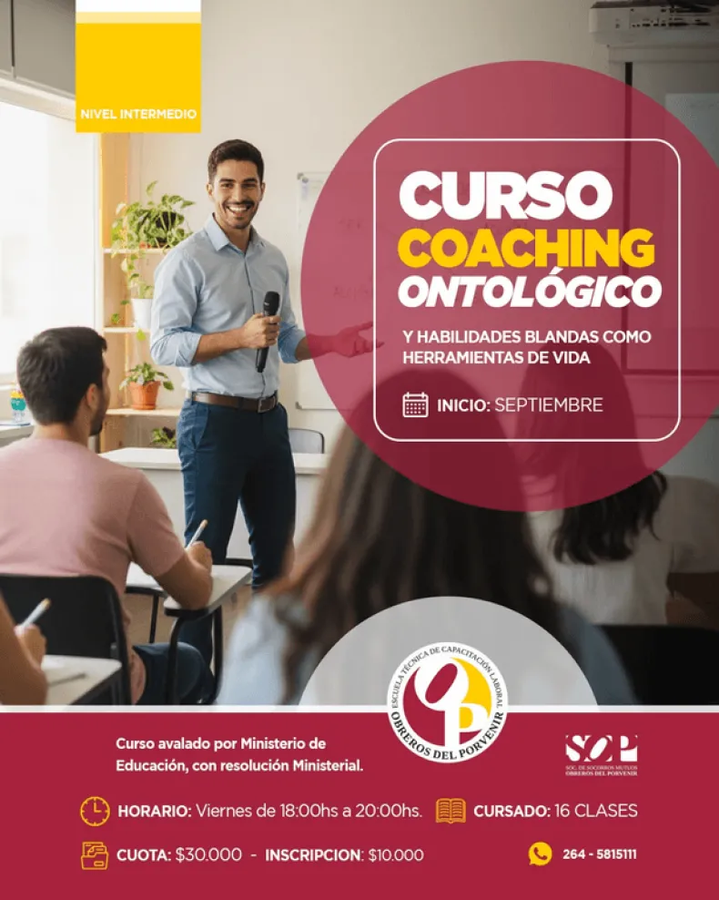 ¡Atención, sanjuaninos! Se viene un curso que promete revolucionar tu manera de pensar y actuar. El curso "Coaching Ontológico y Habilidades Blandas con Herramientas de Vida" arrancará en septiembre y está diseñado para que saques a relucir ese potencial que llevas dentro. Las clases se dictarán los viernes de 18 a 20hs, y para inscribirte, sólo tenés que desembolsar $10.000 al comienzo y una cuota mensual de $30.000.