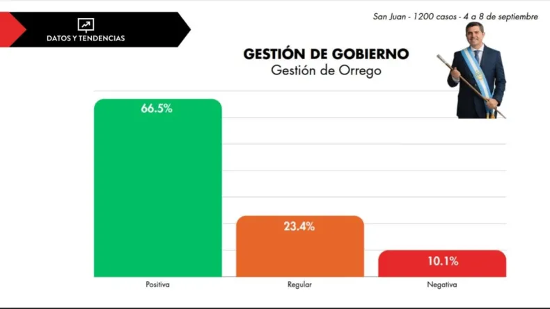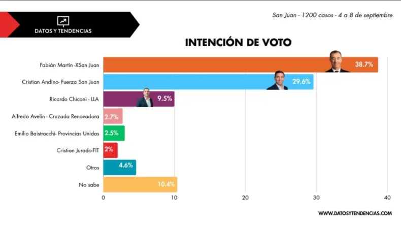 Un sondeo de Datos y Tendencias pone a Fabián Martín, de X Por San Juan , a la cabeza con un 38,7% de apoyo, mientras que la gestión de Orrego goza de un 66,5% de aprobación.