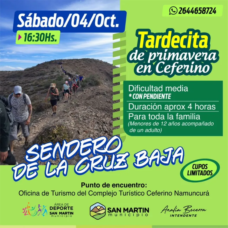 El punto de encuentro será la Oficina de Turismo del Complejo Turístico Ceferino Namuncurá. Dado que los cupos son limitados, se recomienda asegurar el lugar comunicándose al 2644658724.