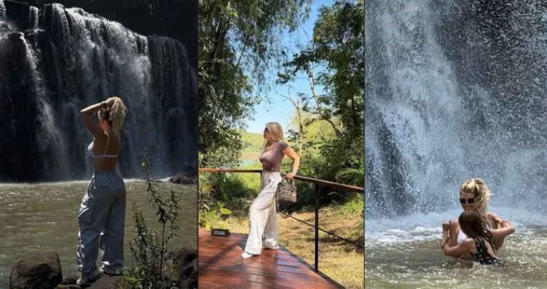 El viaje terminó con Wanda y su hija, de la mano, metiéndose en la laguna de aguas claras frente a la cascada. Ella con ropa de verano, la nena con traje de baño a lunares, las dos iluminadas por el sol del mediodía y rodeadas de la flora local.
