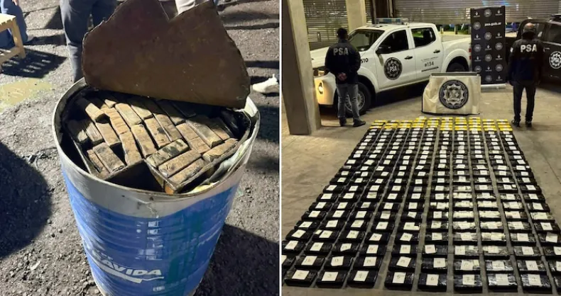 Lo que encontraron adentro de la chata fue un golazo: dos barriles gigantes con doble fondo. ¿Y qué había ahí? Ni más ni menos que 245 panes de cocaína, un total de 255 kilos de la pesada, bien escondidos. ¡Mansa merca querían meter!