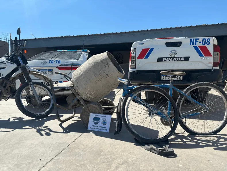 La Policía logró recuperar una hormigonera y una bicicleta que habían sido robadas a una mujer en La Bebida, Rivadavia. La rápida acción de los efectivos permitió localizar los elementos sustraídos en un domicilio del Barrio Nuevo Cuyo.