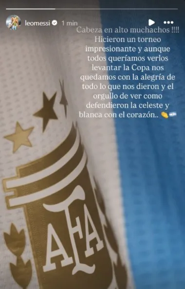 Tras el resultado, Messi utilizó Instagram para expresar su reconocimiento: "Cabeza en alto, muchachos. Hicieron un torneo impresionante y aunque todos queríamos verlos levantar la copa, nos quedamos con la alegría de todo lo que nos dieron y el orgullo de ver cómo defendieron la Celeste y Blanca con el corazón".