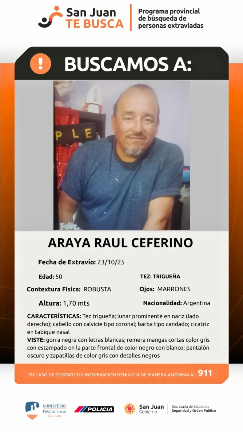 La campaña "San Juan te busca" está en marcha y no hay tiempo que perder. La policía ha solicitado la ayuda de todos para encontrar a Ceferino Araya Rual, un hombre de 50 años que fue visto por última vez el jueves 23 de octubre.