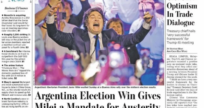 El triunfo de Javier Milei en las últimas elecciones legislativas no pasó desapercibido en el mundo, y el prestigioso diario The Wall Street Journal le dedicó su tema principal. Según los analistas de este importante medio de Estados Unidos, la victoria del presidente fue contundente y le da más fuerza para llevar adelante su agenda de reformas de libre mercado.Para el matutino, el Gobierno recibió un claro "mandato de austeridad" que lo posiciona mejor frente a la política, los organismos internacionales y los inversores. Sin embargo, no todo es color de rosas: el desafío económico y social sigue firme. Los salarios reales, por ejemplo, cayeron más del 20% desde el año pasado y el consumo no levanta cabeza. Por eso, los economistas que consultaron creen que pronto habrá que combinar el ajuste con políticas que reactiven el crecimiento y el empleo para no perder el apoyo de la gente.Esta victoria le da a Milei un respiro frente a los inversores, que venían con dudas sobre si su plan de ajuste fiscal era viable. Los especialistas esperan que este resultado afiance la confianza y facilite que el Fondo Monetario Internacional desembolse los fondos restantes del acuerdo de 44.000 millones de dólares, algo clave para la financiación del país.Alberto Ramos, de Goldman Sachs, calificó el resultado de "muy fuerte y concluyente", sugiriendo que podría mejorar la gobernabilidad si se logran alianzas políticas estables. Además, resaltó que este panorama favorecerá que Estados Unidos siga dando su apoyo financiero. En pocas palabras, el respaldo político que obtuvo el gobierno libertario lo deja más parado frente a Washington y el FMI, que habían condicionado su ayuda a que el plan de ajuste se mantenga en pie.Pero no solo el WSJ puso el ojo en Argentina. Otros medios de peso también se hicieron eco. The New York Times tituló que "Los votantes argentinos otorgan a Javier Milei una victoria crucial", destacando cómo esto fortalece su posición para avanzar con su agenda. Desde España, El Mundo habló de una "sorprendente elección" que ganó el oficialismo al peronismo, analizando el avance del liberalismo en la región.Bloomberg, Financial Times, Reuters y The Washington Post también publicaron sus análisis, coincidiendo en que este triunfo le da un nuevo impulso a Milei para consolidar sus reformas económicas y financieras. Todos señalan que esta elección fue una prueba clave para su administración, que ahora se perfila con un Congreso "más amigable" y un respaldo internacional renovado, especialmente de Estados Unidos.