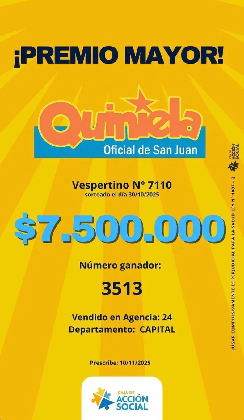 Desde la Caja de Acción Social confirmaron que el número ganador fue el 3513, el que le cambió la vida al afortunado apostador, quien se embolsó nada menos que $7.500.000. Un monto perfecto para encarar los gastos que se vienen, con las fiestas de fin de año y las vacaciones a la vuelta de la esquina.