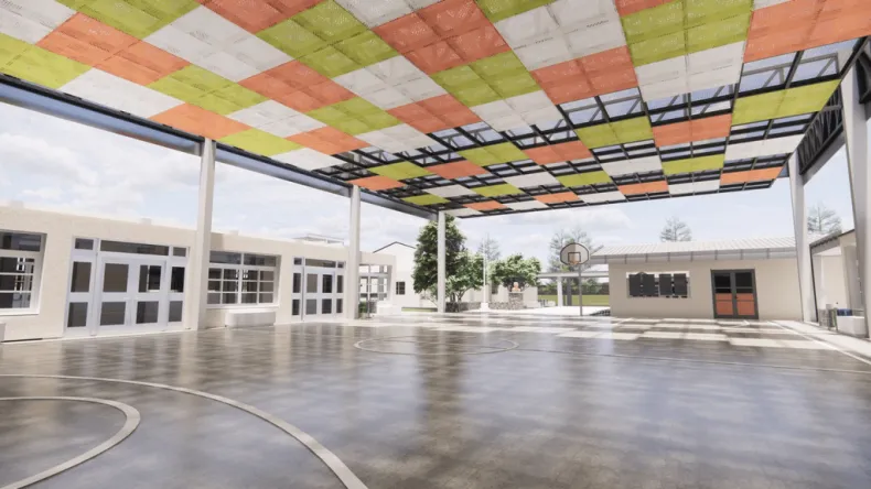 Entre los arreglos figuran el cierre de galerías semicubiertas usando carpintería y mampostería, para protegerse del clima y ordenar las circulaciones internas. También, se techara el patio cívico con chapas perforadas de colores, apoyadas en una estructura mixta de hormigón armado y metal, creando un lugar para que los chicos puedan hacer actividades físicas y recreativas bajo techo.