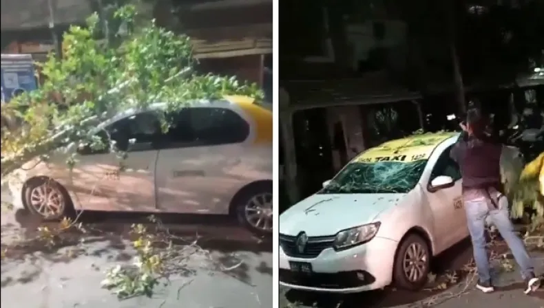 La noche del jueves estuvo movidita en el corazón de San Juan. Mientras el viento se colaba por cada rincón del microcentro, una rama imponente decidió no aguantar más y se desplomó justo sobre un taxi que esperaba en el semáforo de calle Tucumán, entre Mitre e Ignacio de la Roza.