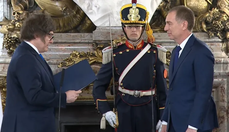 En un acto en el clásico Salón Blanco de la Casa Rosada, el Presidente Javier Milei le tomó juramento a Diego Santilli como nuevo ministro del Interior. La ceremonia fue puro mate y apretón de manos, con la presencia de sus hijos, esposa y dirigentes del PRO que lo respaldan a full.
