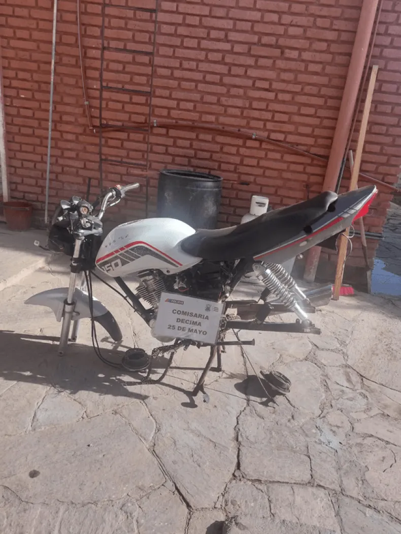 Gracias al trabajo de investigación y varias averiguaciones, las autoridades finalmente encontraron el rodado escondido en un descampado en Calle 3, entre la Ruta Provincial N° 270 y Calle 20. Lamentablemente, la moto no estaba entera: le faltaban las ruedas, el carburador, la batería, el faro delantero, los plásticos laterales, el guardabarro trasero y la chapa patente.