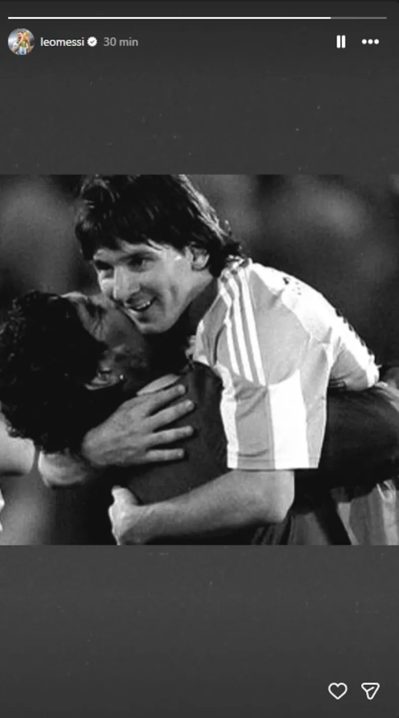 En sus historias de Instagram, el actual delantero del Inter Miami compartió una foto que habla por sí sola: las dos máximas figuras del fútbol argentino, representadas en un abrazo cálido y sincero. La imagen, en blanco y negro, corresponde a un partido del Mundial de Sudáfrica 2010, cuando Maradona dirigía la selección y Messi brillaba en la cancha.