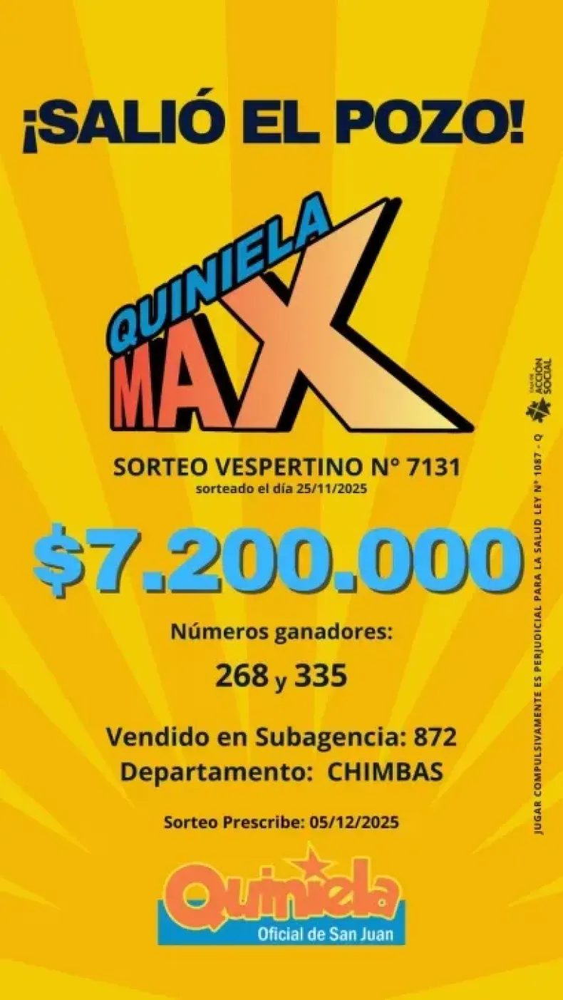 Desde la Caja de Acción Social confirmaron que el ticket ganador salió de la subagencia 872 de Chimbas, donde apostaron los números 268 y 335. ¡Un golazo al buen ojo!