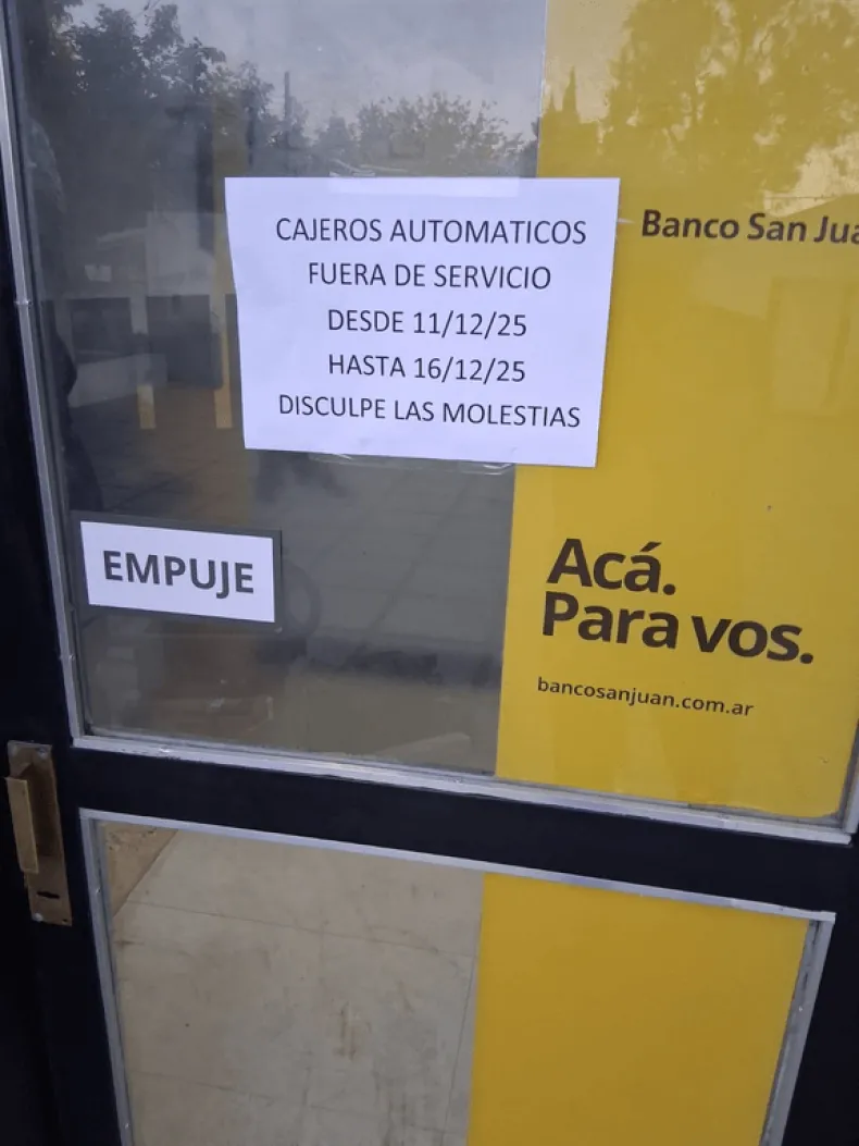 Los dos únicos cajeros automáticos en la Municipalidad de Valle Fértil decidieron tomarse unas vacaciones obligadas desde el miércoles pasado. Un cartel bien clarito anuncia que no van a operar entre el 11 y el 16 de diciembre por unas tareas de mantenimiento que, dicen los que entienden, son indispensables. Pero ojo, esto no cayó sin aviso: desde el municipio aseguran que avisaron por medios locales y, además, pegaron carteles en la misma municipalidad, así que nadie puede decir que no sabía.