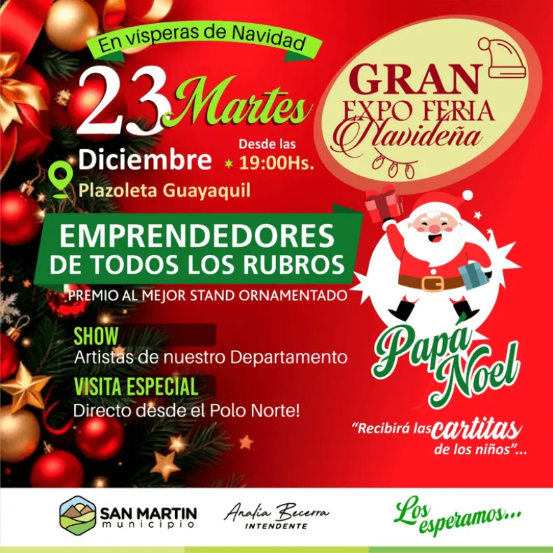 Con la Navidad tocando la puerta, la Municipalidad de San Martín armó una movida que promete sacudir la tarde del martes 23 de diciembre desde las 19 en la Plazoleta Guayaquil. Será la Gran Expo Feria Navideña, un encuentro donde los emprendedores del departamento van a lucir sus productos para que nadie se quede sin ese regalo especial o el toque único para la mesa familiar.