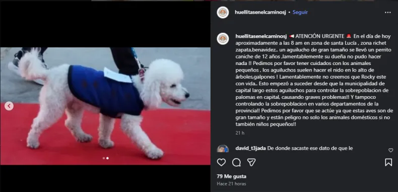 En el tranquilo barrio de Richet Zapata, dentro del departamento de Santa Lucía, una vecina vivió un episodio de película que todavía la tiene sin palabras. Este lunes, un aguilucho enorme descendió de golpe en la calle Benavídez y se llevó a su perrito caniche de 12 años, llamado Rocky, sin darle chance a nada.