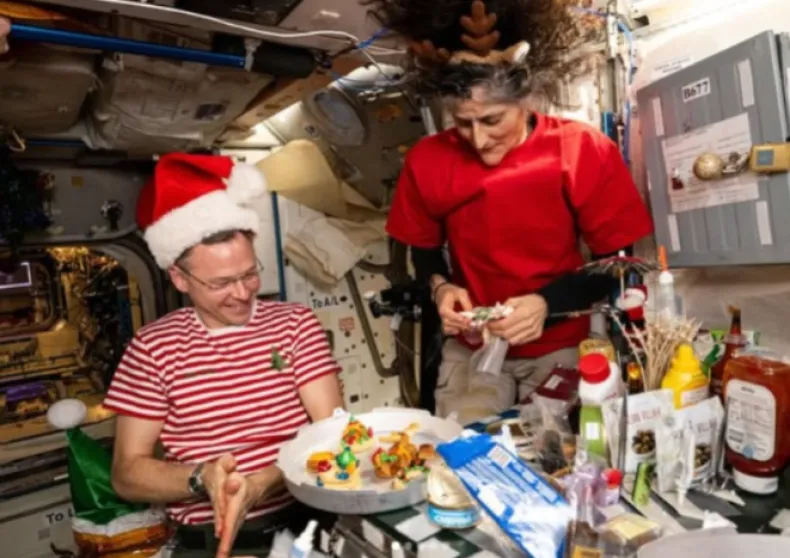 Aunque están a más de 400 kilómetros del planeta, los astronautas no se pierden la Navidad y la celebran con tradiciones adaptadas al espacio, entre risas, gorritos y una comilona con menú especial.