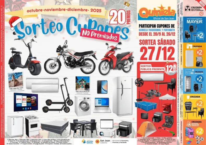 Entre los tesoros que podrían ser tuyos aparecen motos 0 km en varias cilindradas, incluyendo una flamante moto eléctrica que es el sueño de cualquier fanático del motor. Por si fuera poco, también están en juego viajes a destinos que le pondrán sazón a tu verano: Mar del Plata y Villa Carlos Paz. No faltan tampoco los elecrodomésticos que resignifican cualquier hogar: aires acondicionados, Smart TV, lavarropas, heladeras con freezer, notebooks, celulares y más gadgets que hacen la vida más llevadera.