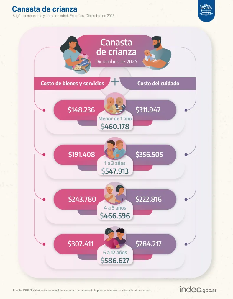 El INDEC aclaró que el valor de los bienes y servicios parte de la Canasta Básica Total (CBT) del Gran Buenos Aires, que incluye desde la comida hasta educación y vivienda. Mientras tanto, el costo del cuidado sale de calcular cuánto cobraría alguien contratado para encargarse de la atención de los chicos, tomando como referencia el sueldo del personal doméstico.