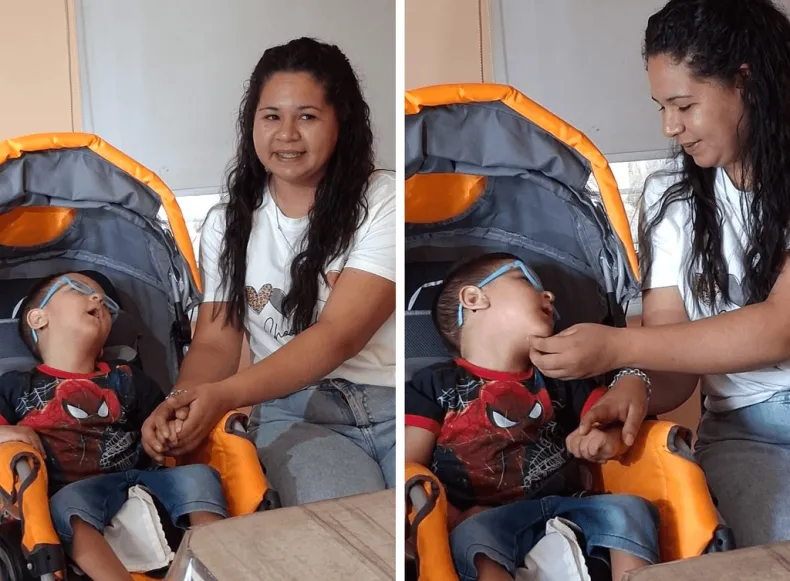 Mateo no la tiene fácil: convive con un combo duro de diagnoses como citomegalovirus congénito, parálisis cerebral, cuadriplejia espástica, hidrocefalia, hipoacusia bilateral, cardiopatía hipertrófica y astigmatismo. Son condiciones que exigen cuidados permanentes y tratamientos específicos que en su provincia son difíciles de conseguir.