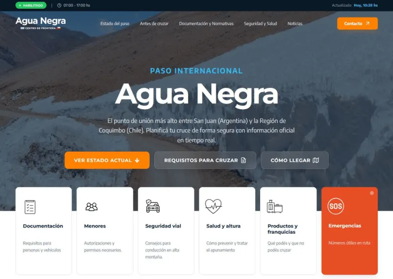 Por si fuera poco, hay un rincón de noticias actualizadas aportadas por el equipo de SISJ, con novedades frescas sobre el Paso de Agua Negra y recomendaciones vitales. En el centro del sitio, vas a encontrar un apartado con la geolocalización del paso para que planifiques rápido y bien, sin vueltas.