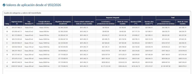 Así, los pagos mensuales no se quedan atrás: arrancan en $42.386,74 para las categorías más bajas y pueden llegar hasta los $1.381.687,90 en la categoría K, especialmente para quienes prestan servicios o alquilan. Esto está basado en la info oficial que ARCA largó sin vueltas.