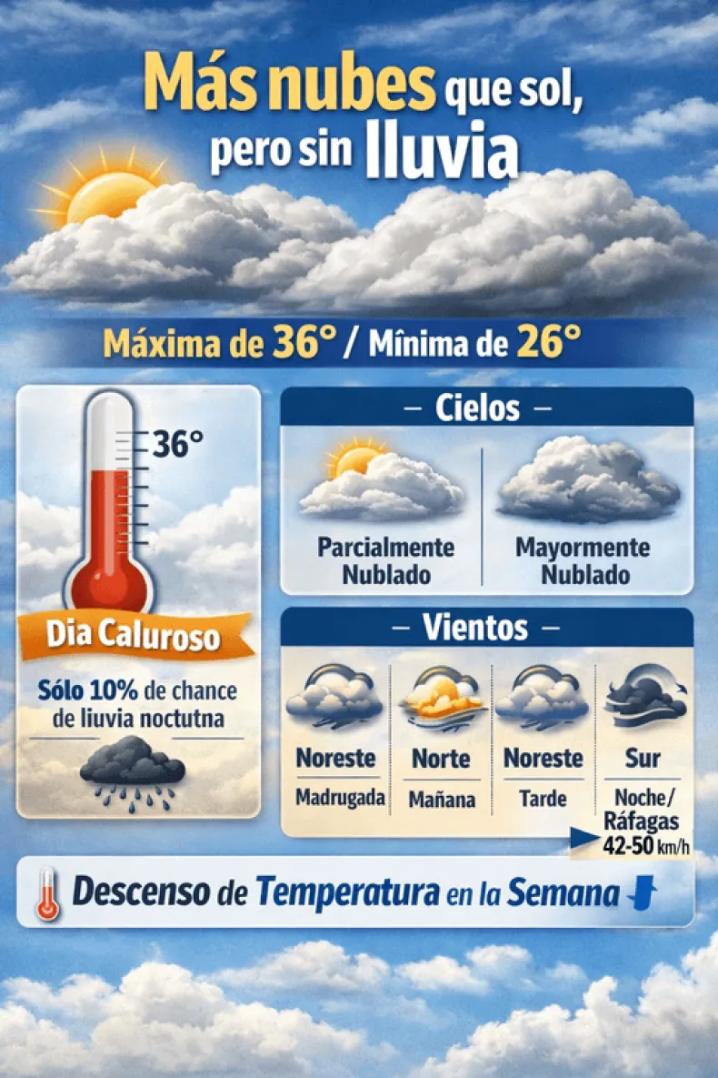 Arrancamos la semana con una máxima que pega fuerte: 36 grados. El cielo se muestra más nublado que despejado, pero por ahora la lluvia anda medio esquiva, apenas un 10% de chance para la noche.