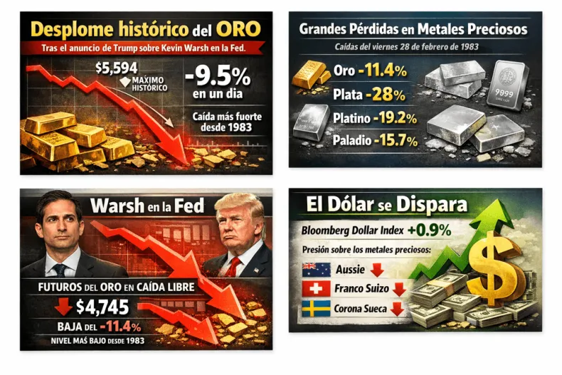 El viernes pasado, el precio del oro se fue de caída libre, marcando su declive más bravo desde 1983, justo después de que Donald Trump anunciara a Kevin Warsh como nuevo presidente de la Reserva Federal de Estados Unidos (Fed). El oro al contado bajó un 9,5%, aterrizando en los 4.883,62 dólares la onza, luego de haber tocado el techo histórico de 5.594,82 dólares el jueves. En el pico de la jornada, la caída llegó a un escandaloso 12%.