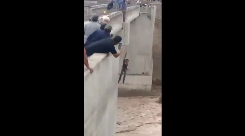 Las lluvias furiosas que azotaron el Gran Mendoza este viernes desataron un verdadero drama en el puente de la Ruta 40, a la altura de Anchoris. Una topadora que trabajaba en el lugar fue arrastrada por la crecida del agua, y un operario quedó colgando casi como un equilibrista, sujetado apenas de una cuerda mientras la corriente amenazaba con llevárselo puesto.