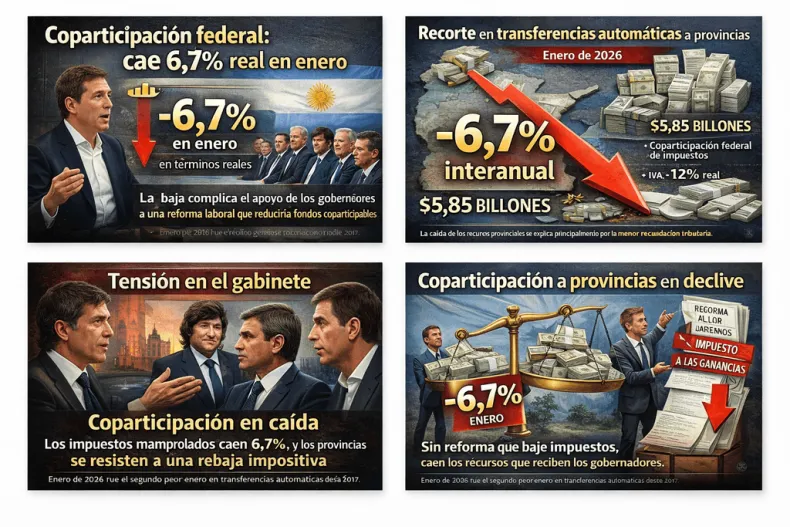En medio de un contexto económico estancado, la coparticipación a las provincias sufrió una caída de casi 7% real en enero, complicando el apoyo a la reforma laboral que plantea una reducción de impuestos y menos plata para los gobernadores.