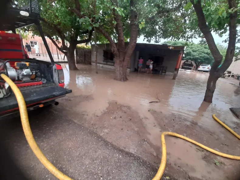 La lluvia no dio tregua en Villa Funes y una vivienda entre Mendoza 13 y 14 quedó completamente inundada. Los Bomberos Voluntarios tuvieron que meter mano para sacar el agua y ayudar a los vecinos.