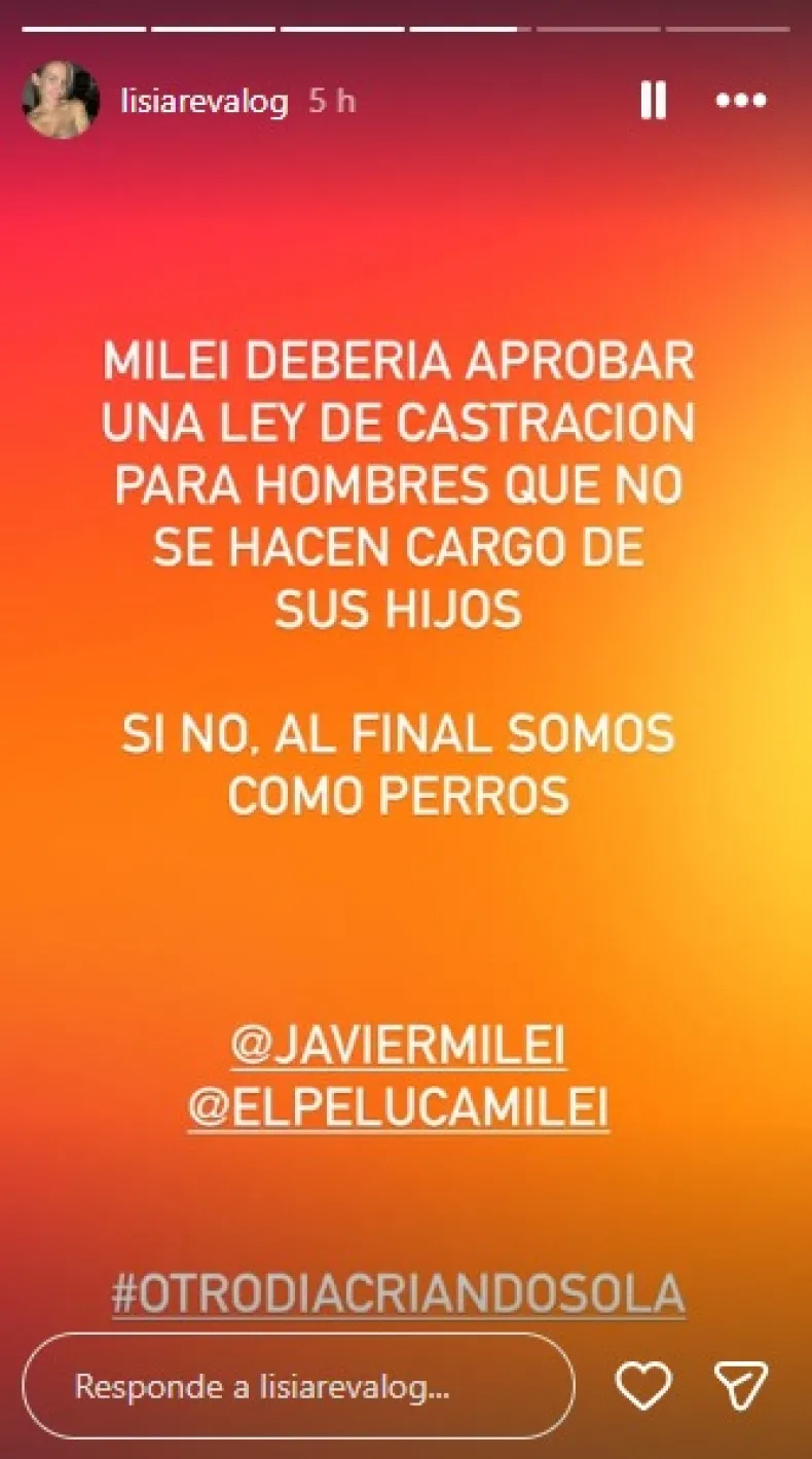 La bomba estalló en Instagram, cuando Lisi lanzó: "Milei debería aprobar una ley de castración para hombres que no se hacen cargo de sus hijos. Si no, al final somos como perros". No se anduvo con vueltas y convocó directamente al presidente a través de sus cuentas oficiales, acompañando la contundente frase con el hashtag #OtroDíaCriandoSola.