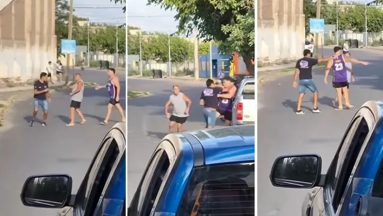 El miércoles a la tarde no fue tranquilo para los que andaban por calle Brasil, bien entre Rawson y Patricias Sanjuaninas, porque tres hombretones decidieron que la mejor manera de arreglar un problema era a las piñas, justo en medio de la calle.