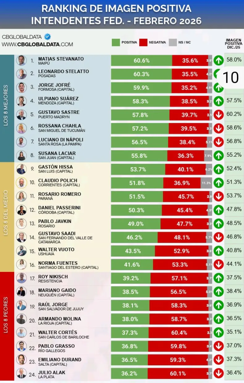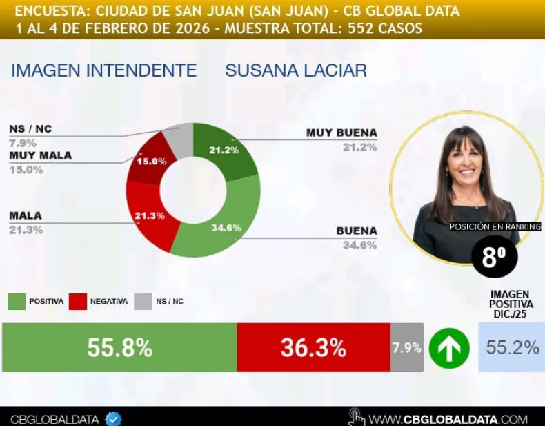 Susana Laciar no afloja y sigue firme en la cumbre del afecto sanjuanino: se posicionó en el octavo lugar entre las mejores intendentes del país, con un contundente 55,8 % de imagen positiva según la encuesta realizada por CB Consultora Opinión Pública entre el 1 y 4 de febrero de 2026.