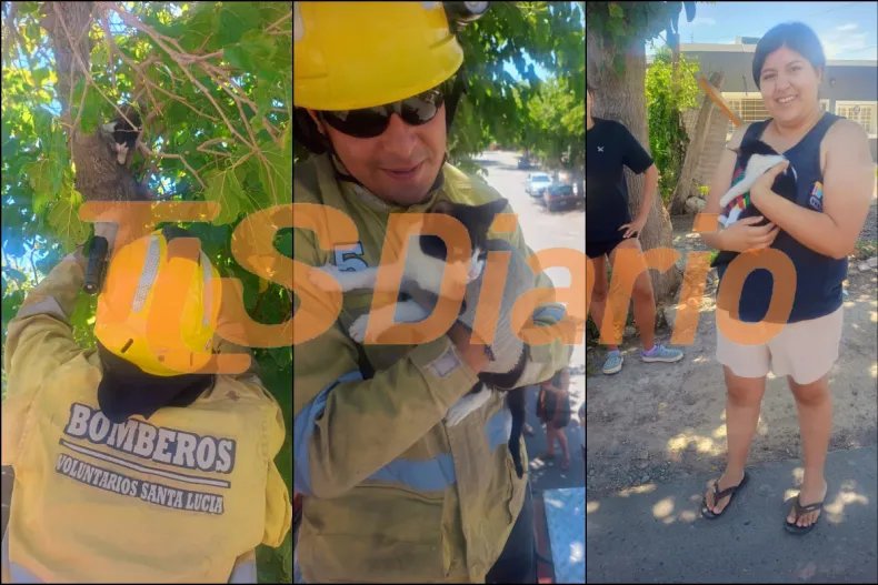 Cerca de las 14 horas del lunes, los bomberos voluntarios de Santa Lucía recibieron un llamado desesperado de Maira Robledo, una mujer de 31 años que estaba preocupadísima porque su gato se había subido a la copa de un árbol de mora y no podía bajar ni por asomo. El animalito, un gato macho de apenas cinco meses, con su pelaje negro y blanco, estaba tan asustado como atrapado y llevaba rato sin poder encontrar la salida.
