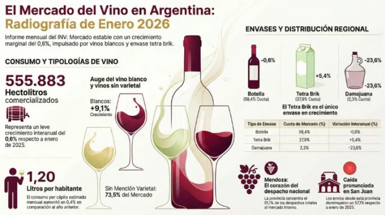 Arrancó el 2026 y el mercado interno de vinos argentinos mostró números que no paran de dar que hablar. Con 555.883 hectolitros despachados en enero, el crecimiento nacional fue un tímido 0,6%. Pero ojo que esta cifra oculta una historia bien diferente entre nuestras provincias.